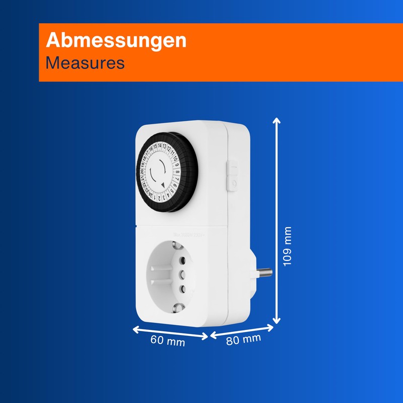 - Further details: timer with protective conductor and increased touch protection. Use in dry interiors. Power consumption at zero load: 0.04W. Dimensions: (L x W x H): 109 x 60 x 80 mm. Weight: 100g