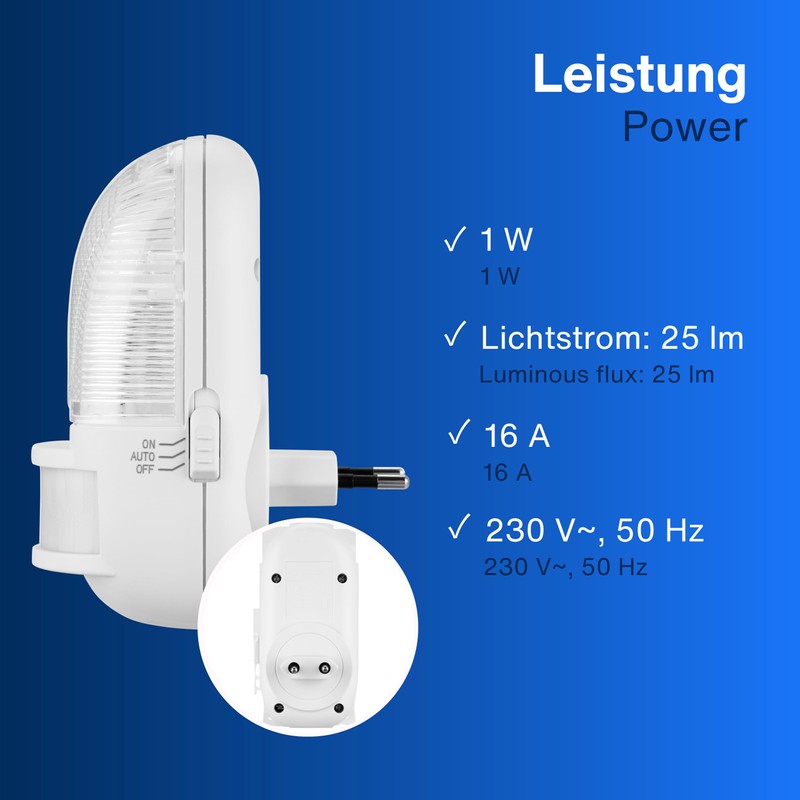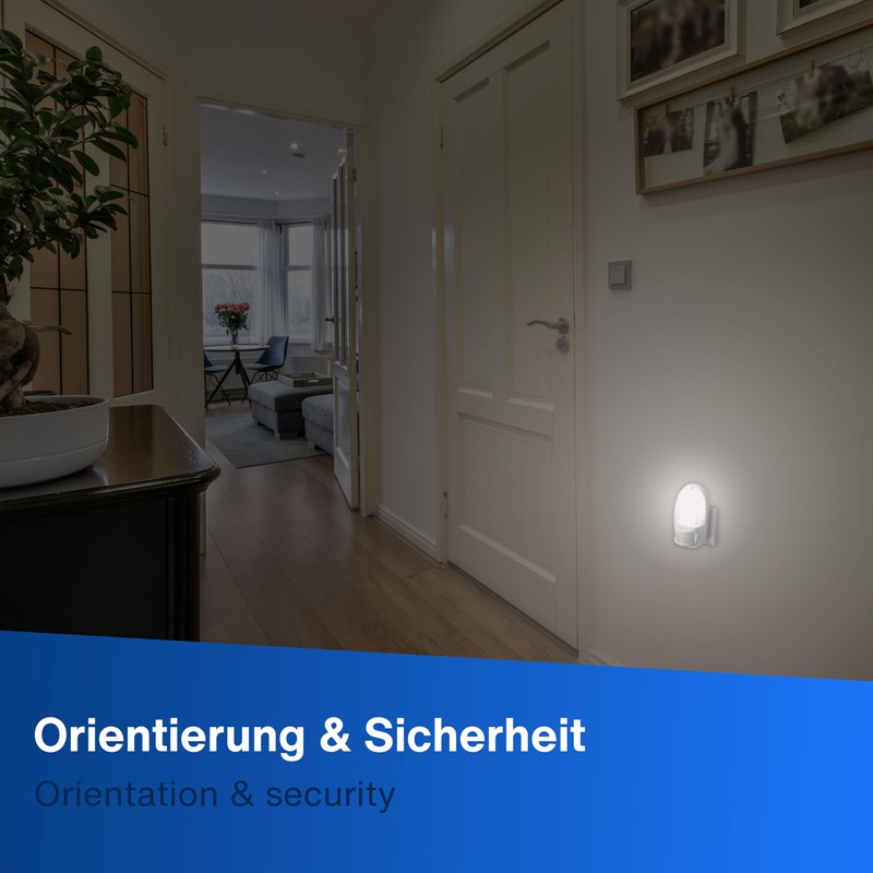 - Instructions for use: this is not an emergency lamp. The night lamp only works with an active mains and does not turn on in the event of a power failure. Switching time 1 minute / continuous operation possible