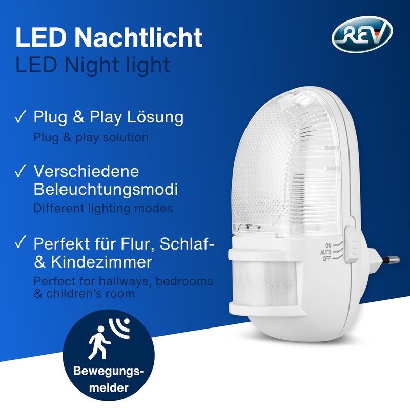 REV Night Light Socket Lamp with Motion Sensor, Detection Range 110° up to 5 m, LED Night Light Socket, White