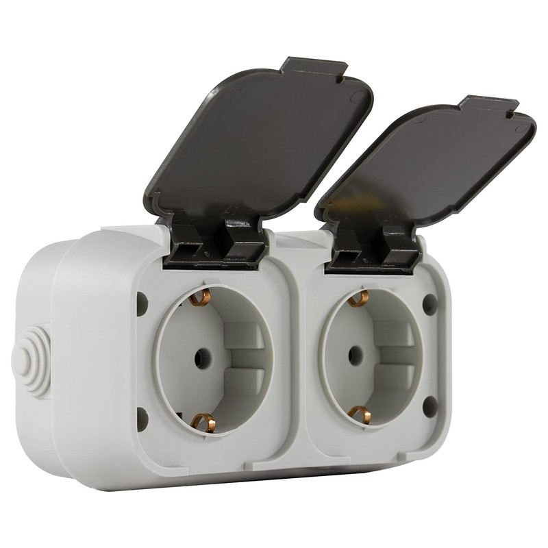 - The double socket has two dark grey hinged lids, which protect against moisture. Ideal for the use of IPx4 angled plugs outdoors