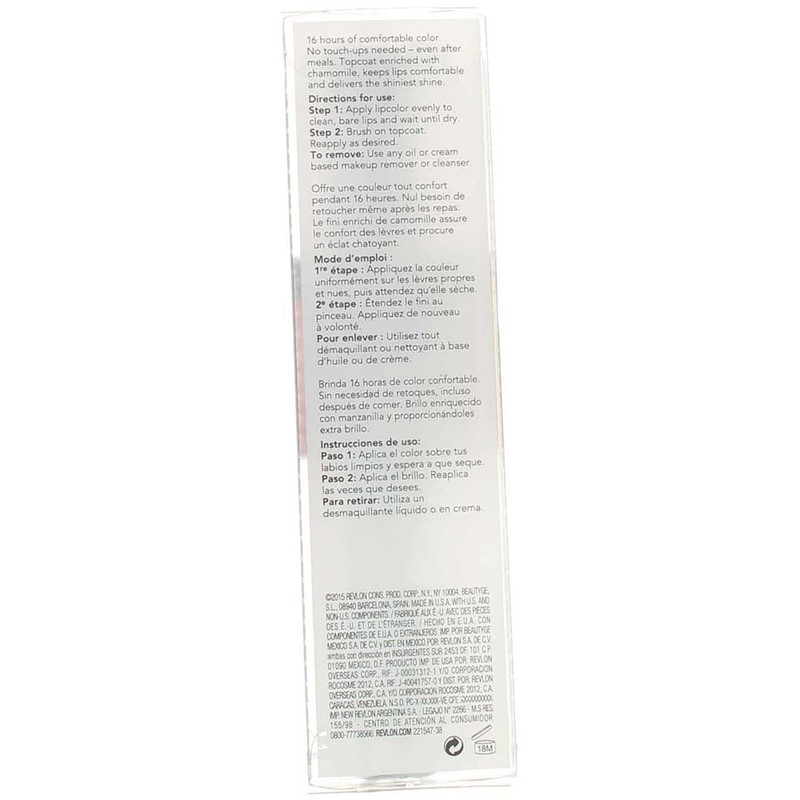 One end smoothes on advanced ColorStay liquid formula with SoftFlex for beautiful, comfortable color that won't kiss off, feather or bleed. The other end brushes on a moisturizing top coat with chamomile and soy extract for all-day glossy softness. EXPERT TIPS:Step 1: Apply lipcolor evenly to clean, bare lips and wait until dry. Step 2: Brush on moisturizing topcoat over color; reapply as desired.