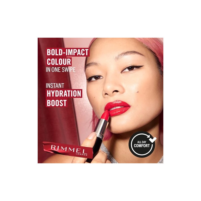 Live the London Look with Rimmel London Lasting Finish Lipstick. Achieve up to 8 hours of elegant-glow lips that offer 25% more color impact with Rimmel's range of vibrant lip color shades. Turn heads and break hearts with this range of stunning colors. With exclusive Black Diamond pigment complex, light is reflected like never before, leaving lips with a shimmer that brightens and illuminates, giving the illusion of a fuller, plumper pout. Whatever elegant lipstick color you choose, Rimmel's long-lasting, vegan formula ensures that your iconic look stays picture perfect all day and all night long, for the ultimate red carpet glamour.