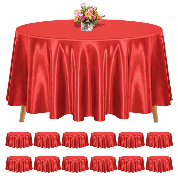 REWOMC 12 Pack 120 Inch Round Tablecloth, Red Satin Fabric Table Cloth for Round Tables, Wrinkle Resistant Washable TableCover Bright Silk Table Clothes for Wedding Party Dining Tables Banquet