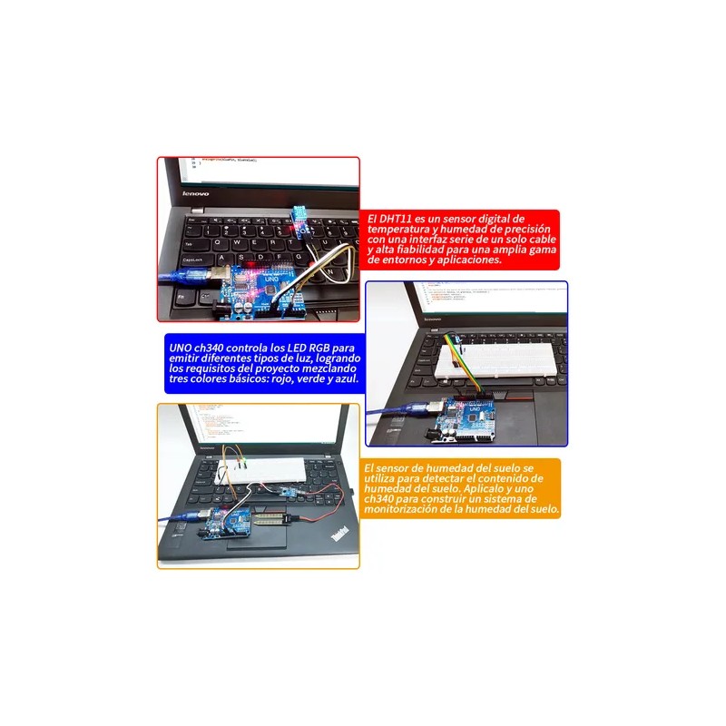 REXQualis Básico Kit Compatible Con Arduino Uno Con Español Tutorial, Placa controladora CH340 UNO R3, placa de pruebas 830, 120 resistencias y otros módulos diversos