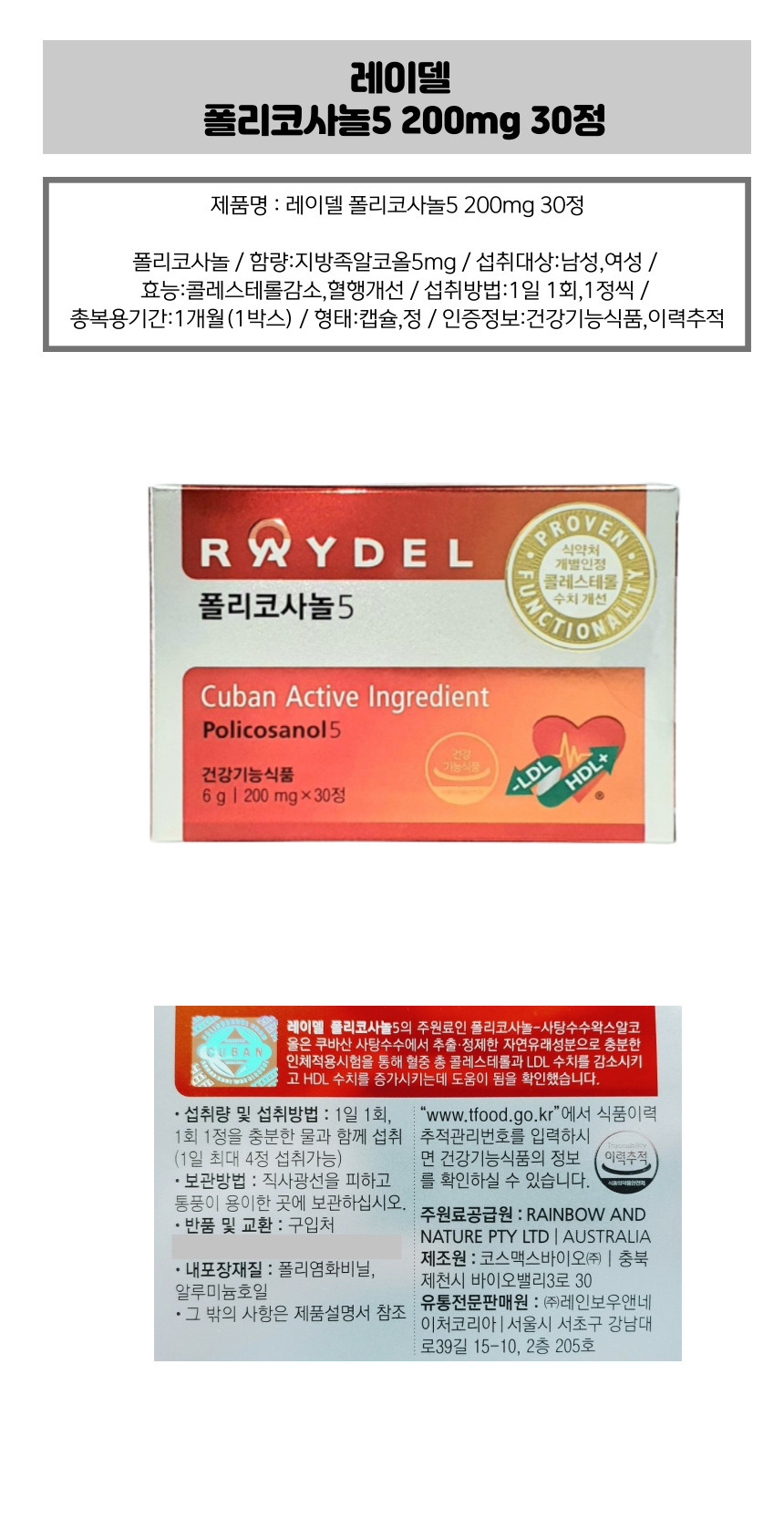 Reydel Policosanol 5 200mg 30 tablets 1 unit Cholesterol Blood pressure / 레이델...