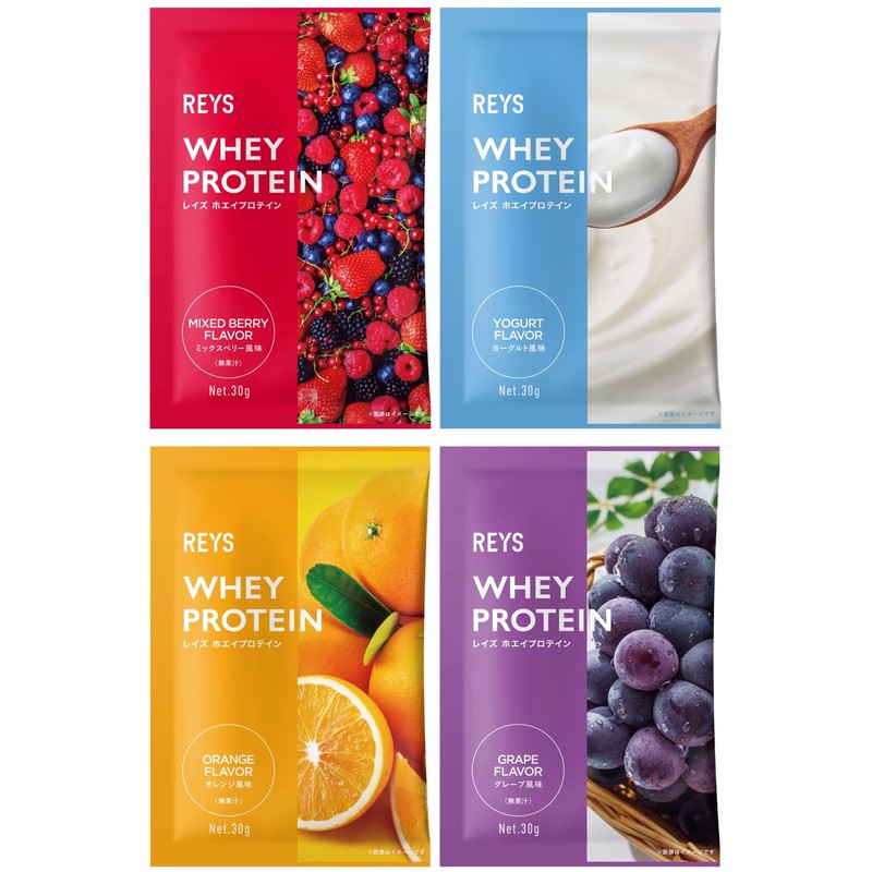 REYS レイズ ホエイ プロテイン お試し セット 個包装 30g × 4種 山澤 礼明 監修 国内製造 ビタミン7種配合 WPCプロテイン ぷろていん ホエイプロテイン ミックスベリー ヨーグルト オレンジ グレープ (4個セット, フルーツ&ヨーグルトフレーバー)