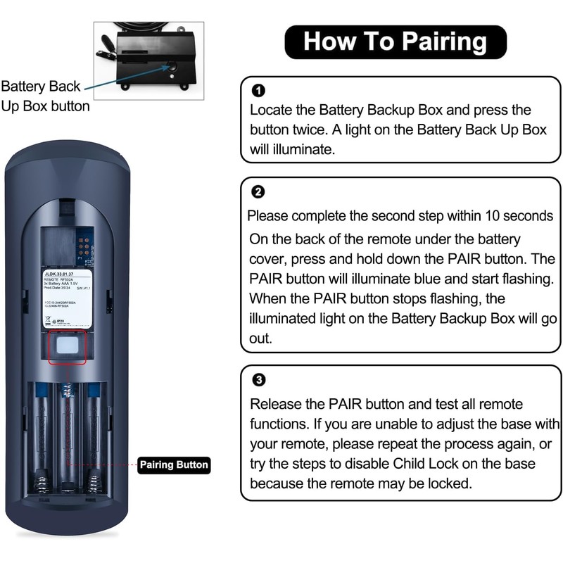 • 【PAIRING STEPS】Step 1) Please ensure your base remote has fresh batteries. Step 2) Locate the Battery Backup Box and press the [POWER DOWN] button twice. A light on the Battery Backup Box will illuminate. Step 3) On the back of the remote, press and hold down the PAIR button. The PAIR button will illuminate blue and start flashing. When the PAIR button stops flashing, the illuminated light on the Battery Backup Box will go out. Step 4) Release the PAIR button and test all remote functions.