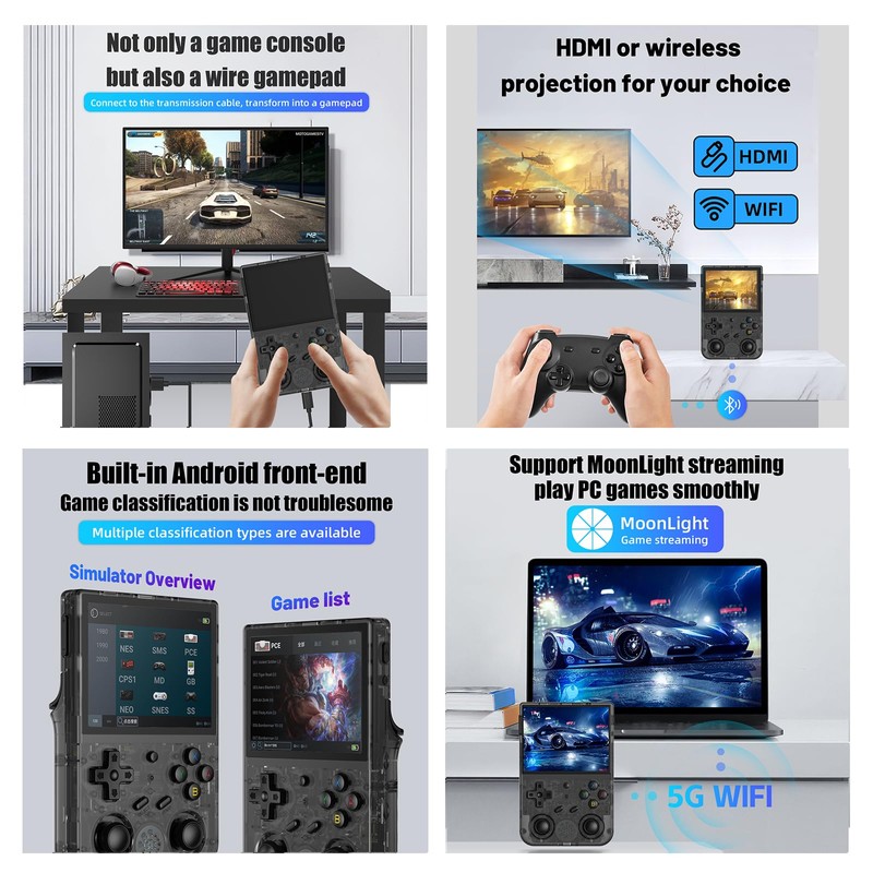 - 【Dual OS System Android11+Linux】This RG353V handheld game console has Linux 64 bit system compatible with 32 bit applications and Android, supporting wired handle function, multimedia network play and Android built-in front-end. When you use the Android system, it is not only a game console, but also a multi-function entertainment device.