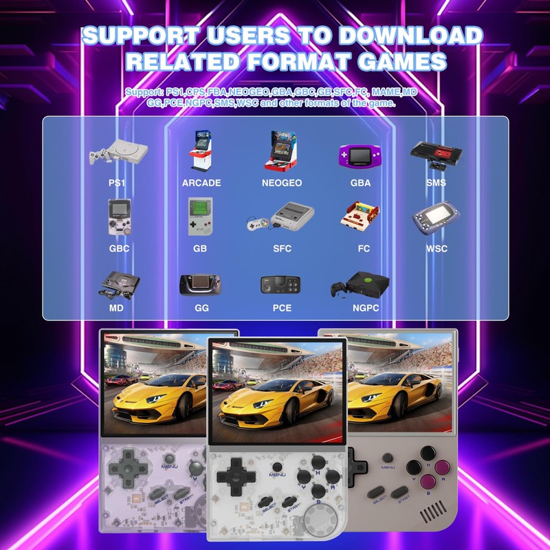 - Various game emulators free: RG35XX has a built-in 64G TF card and more than 5470 games are pre-installed. Support: PS1, CPS, FBA, NEOGEO, GBC, GB, SFC, MAME, MD, GG, PCE, NGPC, SMS, WSC and other game formats. In addition, users are also supported to download games in related formats.