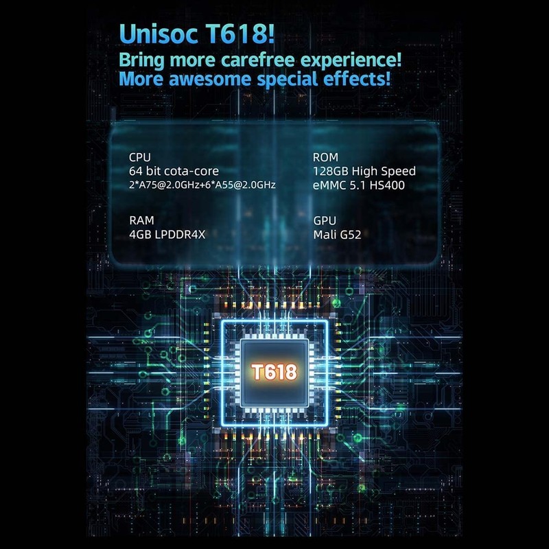 - [ Fantastic Cost to Performance. CPU Chip Unisoc Tiger T618 ]: Unisoc Tiger T618 uses 12nm manufacturing process to bring users a better overall experience! Two 2.0 GHz ArmCortex-A75 CPUs and six 1.8 GHz ArmCortex-A55s provides strong performance for the cost!