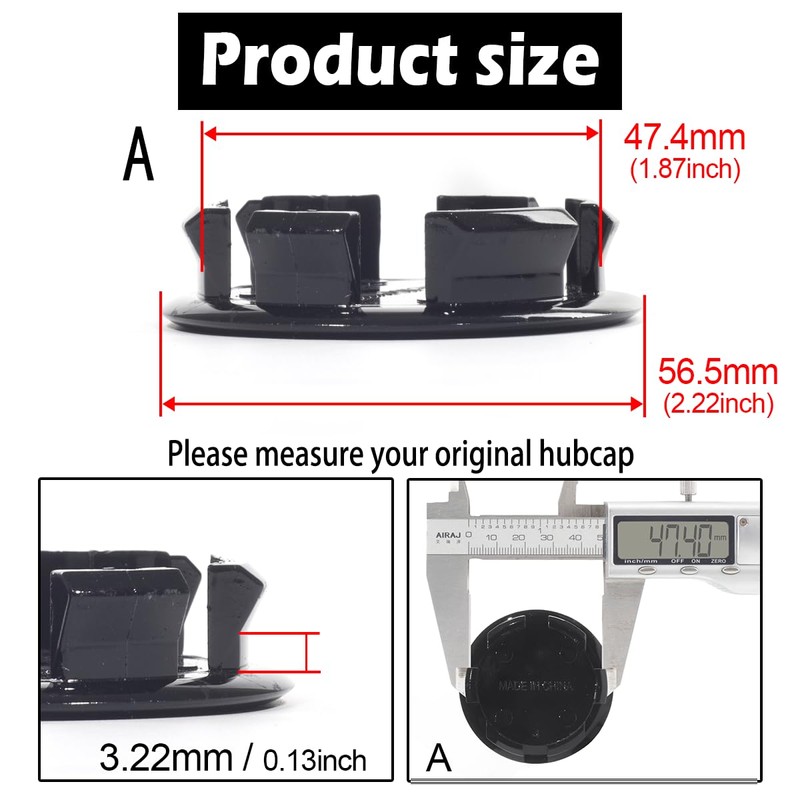 • Size: Outer diameter is 56.5mm(2.22inch), snap inner diameter is 47.4mm(1.87inch), snap length is 3.22mm(0.13inch), height is 13.4mm(0.53inch). Please use a digital caliper to check the center bore size if you are not sure. For the models with the diameter of the wheel center hub cover parameters errors are within 0.5mm for the success of fitment.