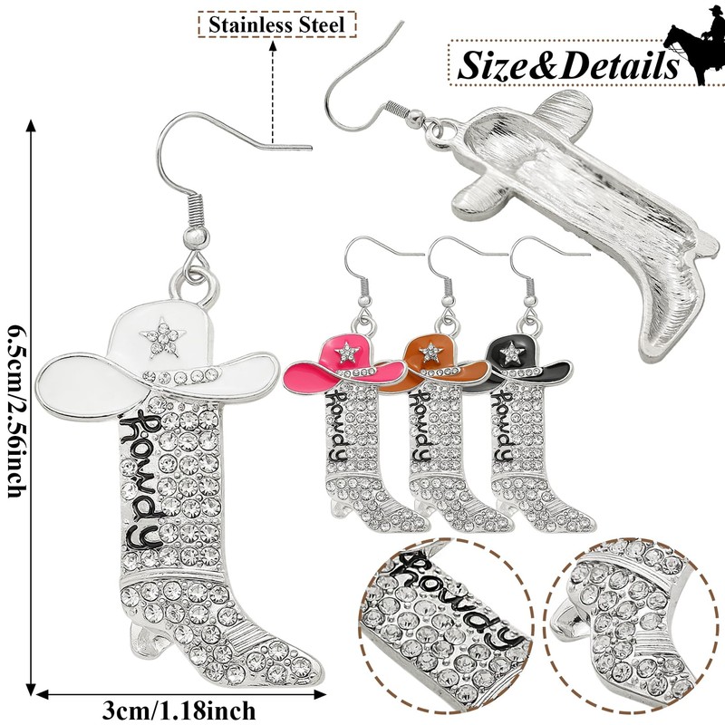 - Quality Material: These cowgirl boots and cowboy hat earrings are made from small crystals with an enamel hat that is super lightweight and perfect for all day wear! You can wear them to run errands, chase pigs or spend the night in town. No matter what you are doing, no need for naked ears! The western boots part 2"x 1".