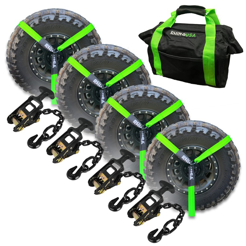 - ✅ COMPLETE TIE DOWN KIT - (4) 2 Inch x 96 Inch Lasso Straps, (4) T-Handle Ratchets with Chains, Carry Bag & Securing Velcro