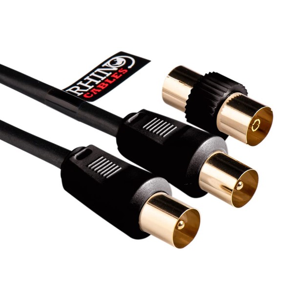 rhinocables Aerial Coaxial Cable with Gold-Plated Connectors, Male to Male RF Coax Lead with Female Adapter Coupler for Freeview, Freesat, Sky, Virgin, BT, You View, Satellite TV, Black (50cm)