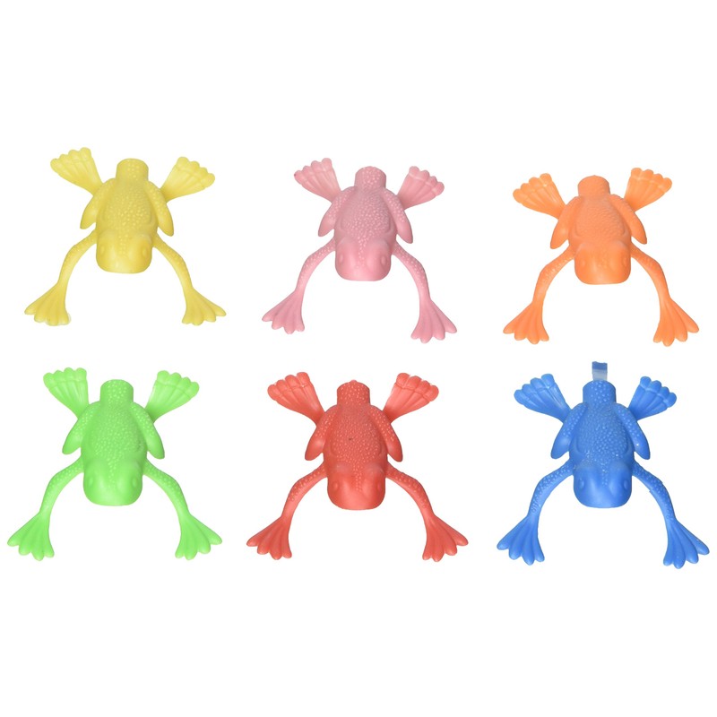 Simply press down on the tail to get these plastic 2 inch frogs to jump skyward. Assortment of colors may vary. Fun party favors.