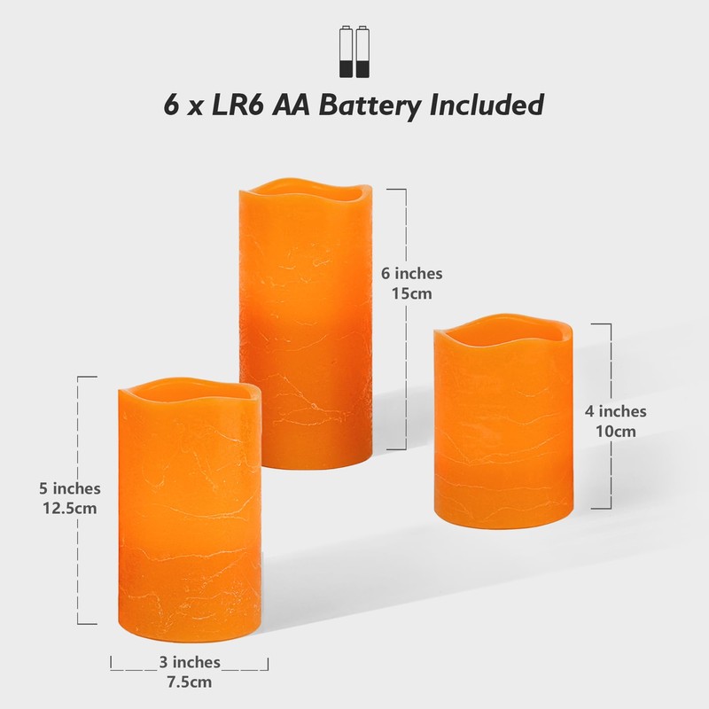 • CANDLE SET & DIMENSION - 3 orange pillar candles and 6 x AA batteries in a set. Candle size: D 3'' x H 4''/5''/6''.