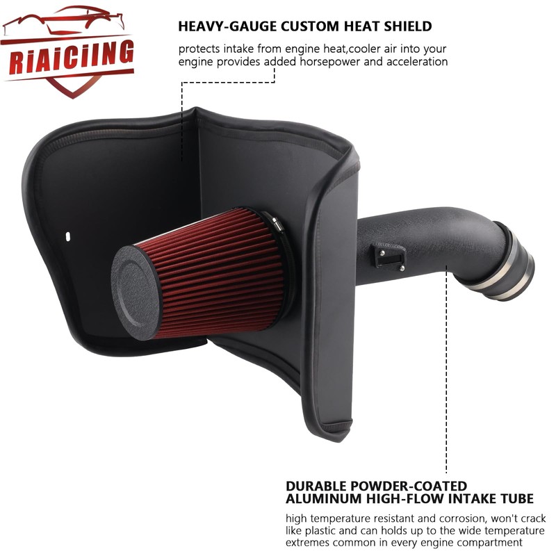 - 【High Performance】RiAiCiING cold air intake systems provide a less restrictive path for airflow, increasing the volume of cool, oxygen-rich air into your engine to increase 5-10% horsepower & 6-8% torque, improveed fuel economy. Also your engine will growl duringacceleration and return to silence after acceleration