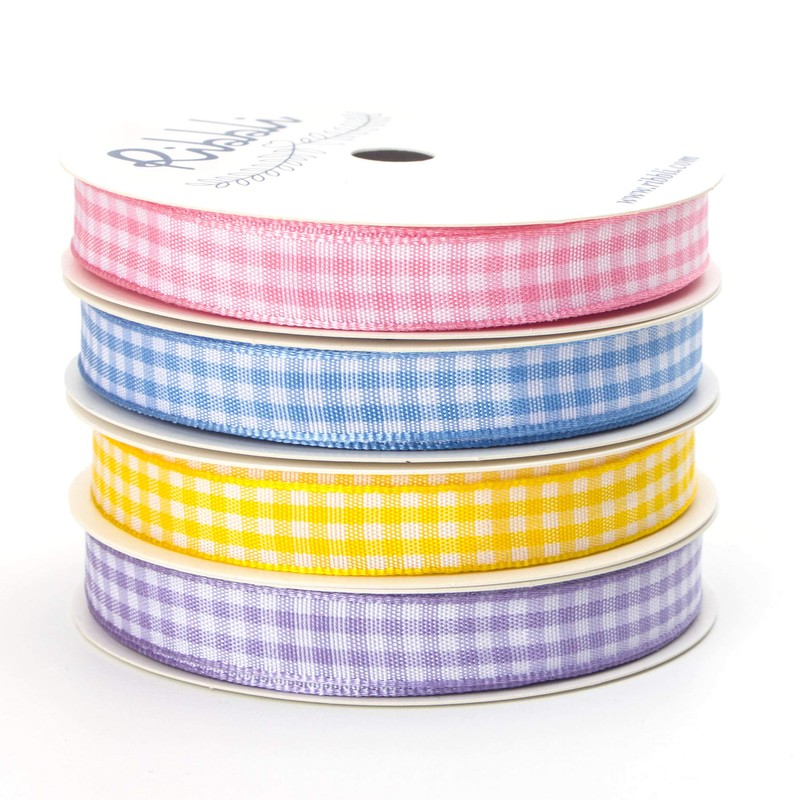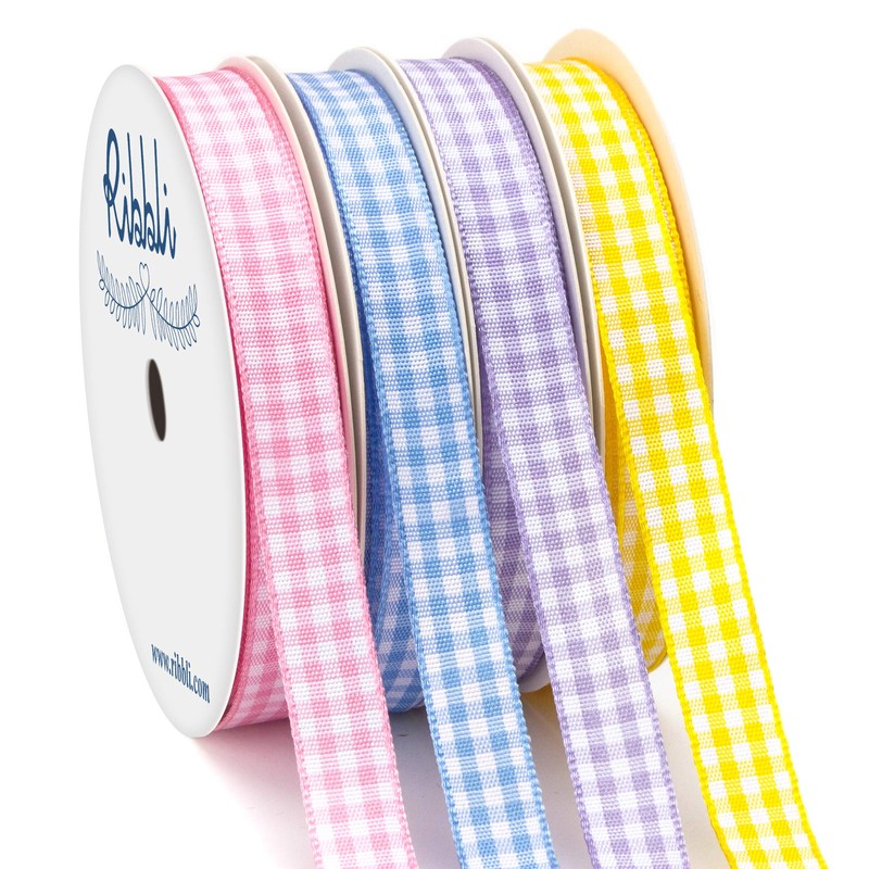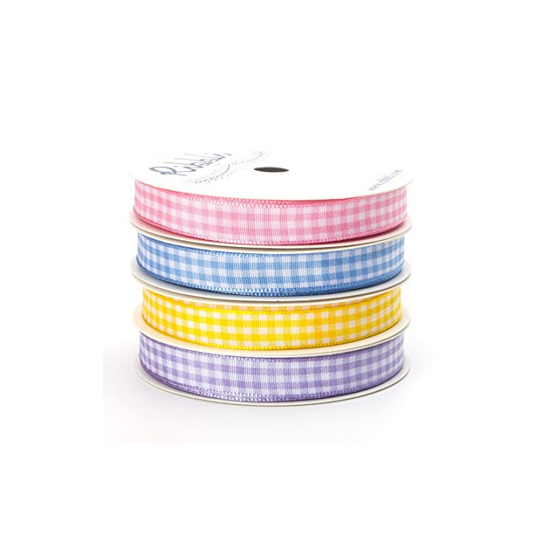 Ribbli 4 Rolls 3/8 Inch Gingham Ribbon,Total 40 Yards,100% Polyester Woven Edge,(Lt.Pink/Lt.Blue/Lt.Purple/Yellow),Easter Ribbon,Check Ribbon Use for Baby Shower,Gift Wrapping