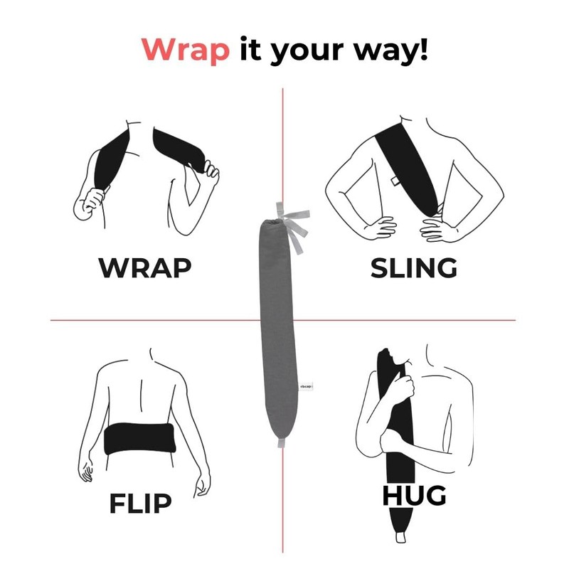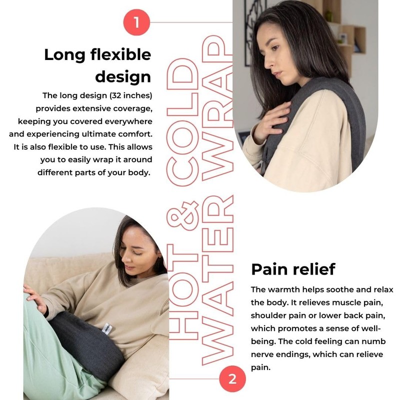 - 👐🏼 Hands-free: The hot & cold water wrap has a convenient strap that allows you to wear it around your body in a variety of ways: draped over your shoulders, wrapped around your waist or attached to specific areas for targeted relief.