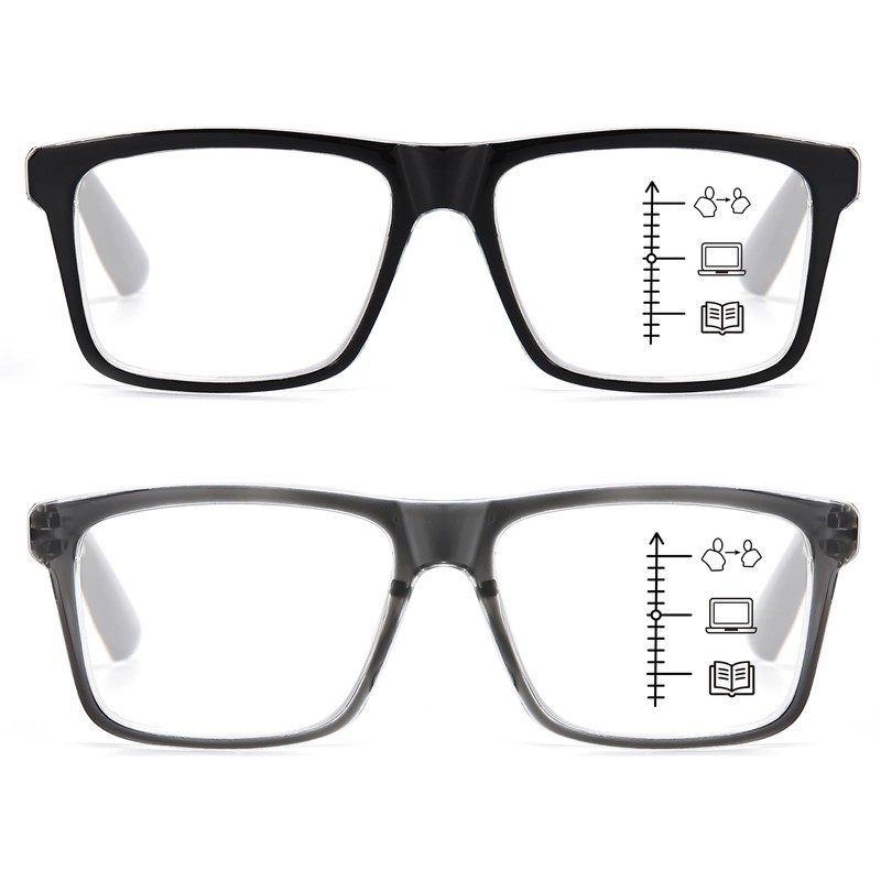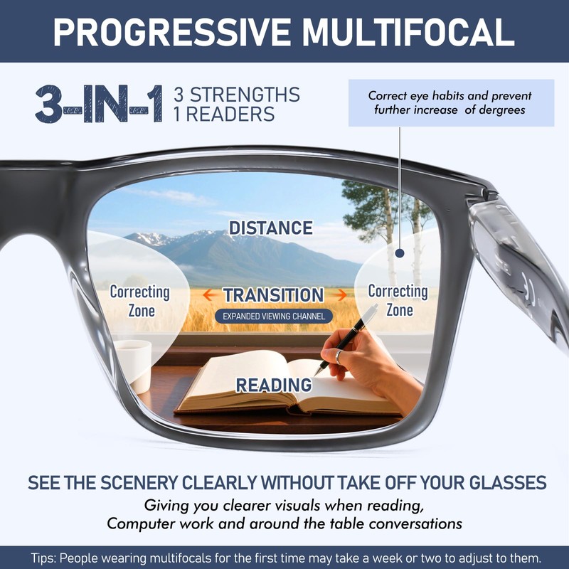 • 【2 Pack Stylish Progressive Readers】Multifocal reading glasses help middle-aged and elderly people get better visual experience with 3 viewing areas, for distance vision use(top lens), intermediate use(middle lens with transition strength) and near vision use like reading(bottom lens with regular reading strength). A set of 2 packs means you can keep one at home and one in the office. No lines, no hassle—just smooth transitions. Convenient keep it for different places.