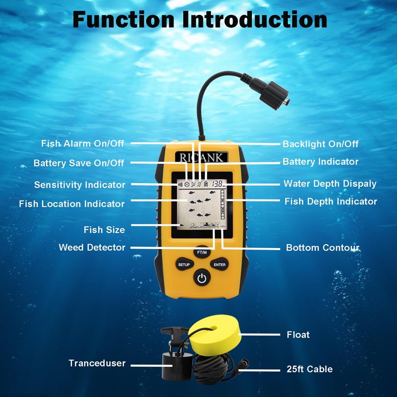 - 【Fishes and Contour Readout】The fish finder portable detects and displays water depth, approximate fish location, fish size, short & tall weeds, sand & rocks on bottom.
