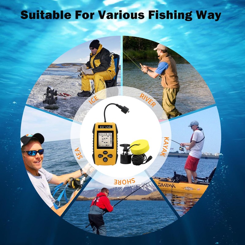 RICANK Kayak Portable Fish Depth Finder Handheld Fish Finder Contour Readout Fishfinder Ice Shore Boat Fishing Fish Detector Device with Sonar Sensor Transducer and LCD Display Gear Yellow