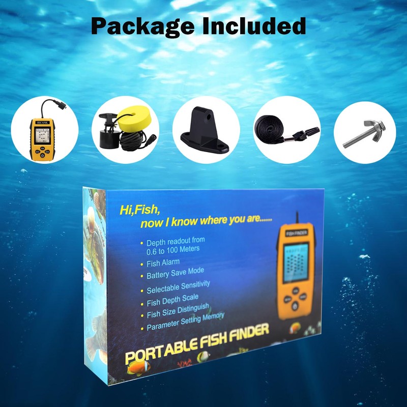 - 【Depth Readout】 The fish finder portable detector range is in a 45°cone underwater. The detection of depth range is from 3ft(1m) to 328ft (100m) below fishing sonar transducer. The fishing sonar sensor is with 25 ft cable and removable transducer float. Water depth shows by meters/feet.
