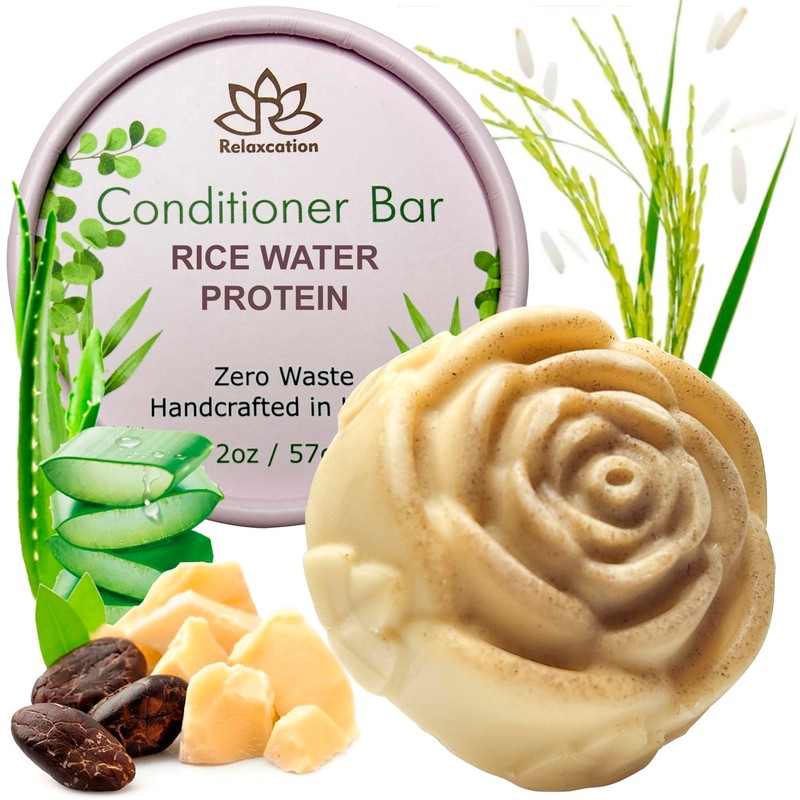 - RELAXCATION RICE WATER PROTEIN CONDITIONER BAR infused with potent ingredients such as Aloe Vera, Rice Protein, and Rice Bran Oil, known for their hair-strengthening properties. These ingredients work in synergy to promote hair growth and improve overall hair health.