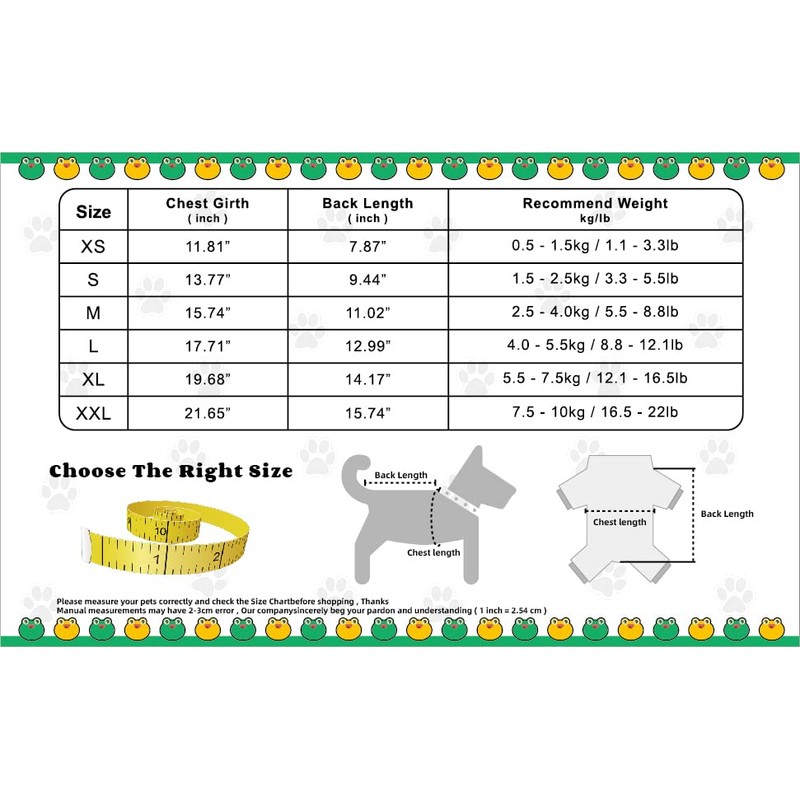 - We have received feedback from customers that they have encountered some difficulties when dressing their pets in our clothing due to the accuracy and snug fit of our size design. We understand that this has caused inconvenience for our customers, so we have made an emergency modification by slightly increasing the size design. Now, it will be easier for you to dress your pets. We appreciate the feedback from each and every one of our customers!