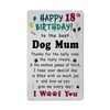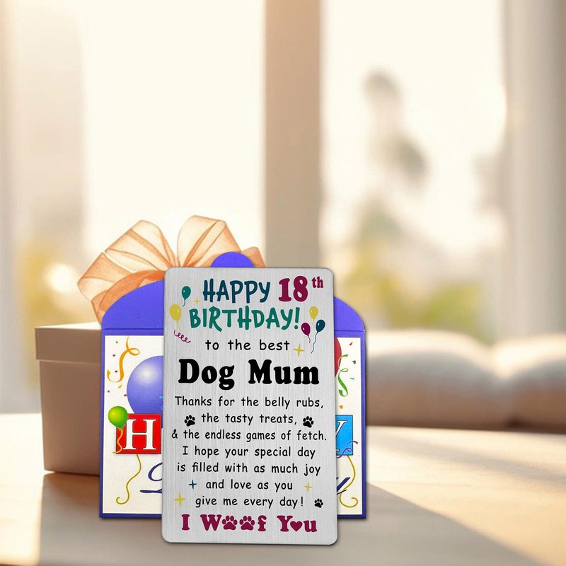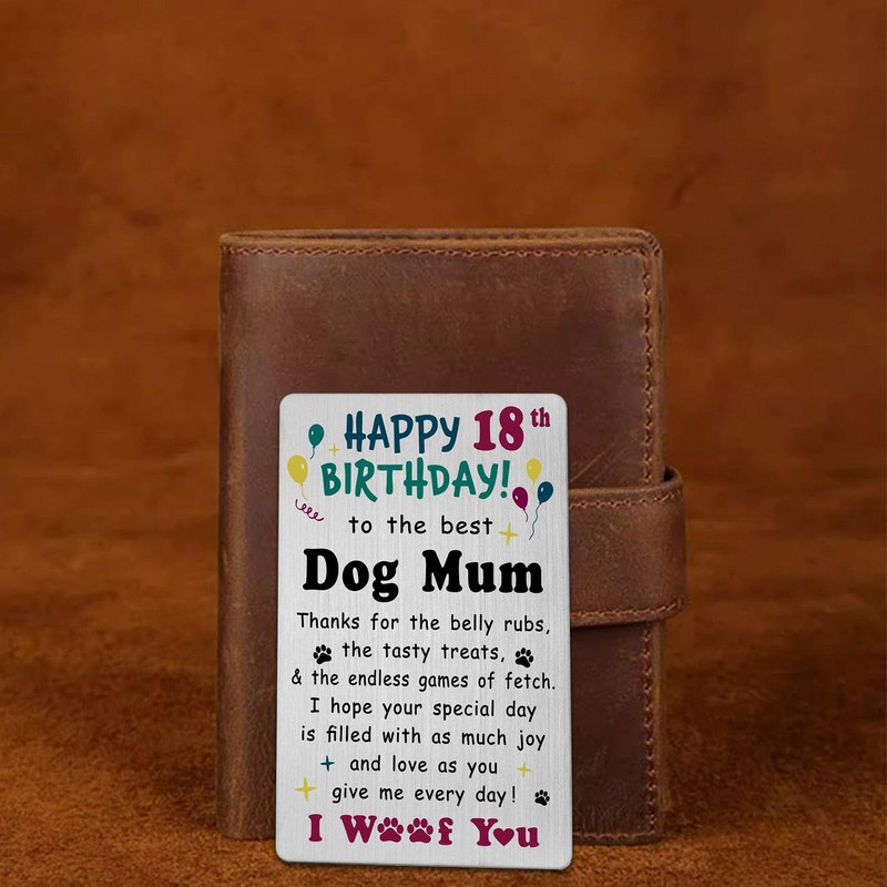 - Mum 18th Birthday Card from Dogs - Engraved with a loving message from your dog: "Happy 18th birthday to the best dog mum! Thanks for the belly rubs, the tasty treats, and the endless games of fetch. I hope your special day is filled with as much joy and love as you give me every day. I woof you."