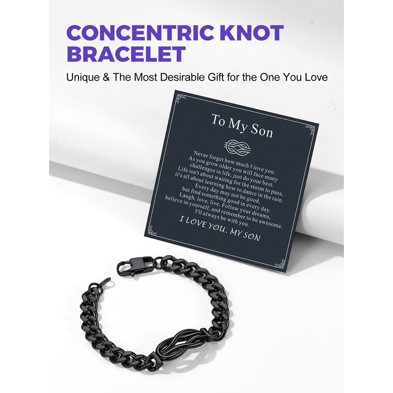 - Gift Card To My Son: Cool bracelet jewelry gift for Son, Crafted with a timeless stainless steel infinity knot design, this meaningful bracelet symbolizes an unbreakable bond of love and commitment. Each bracelet comes elegantly packaged in a gift box and includes a heartfelt wish card, deeply express your love for him