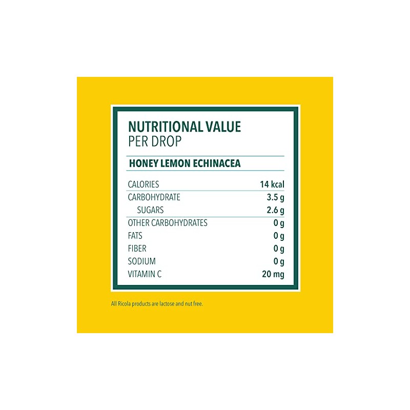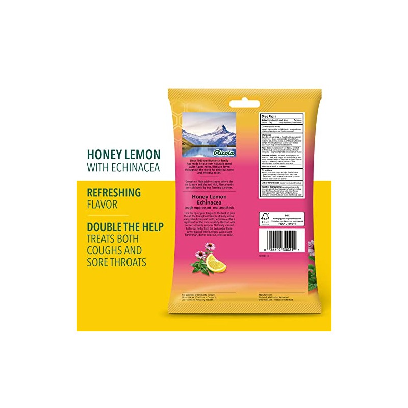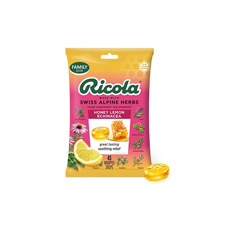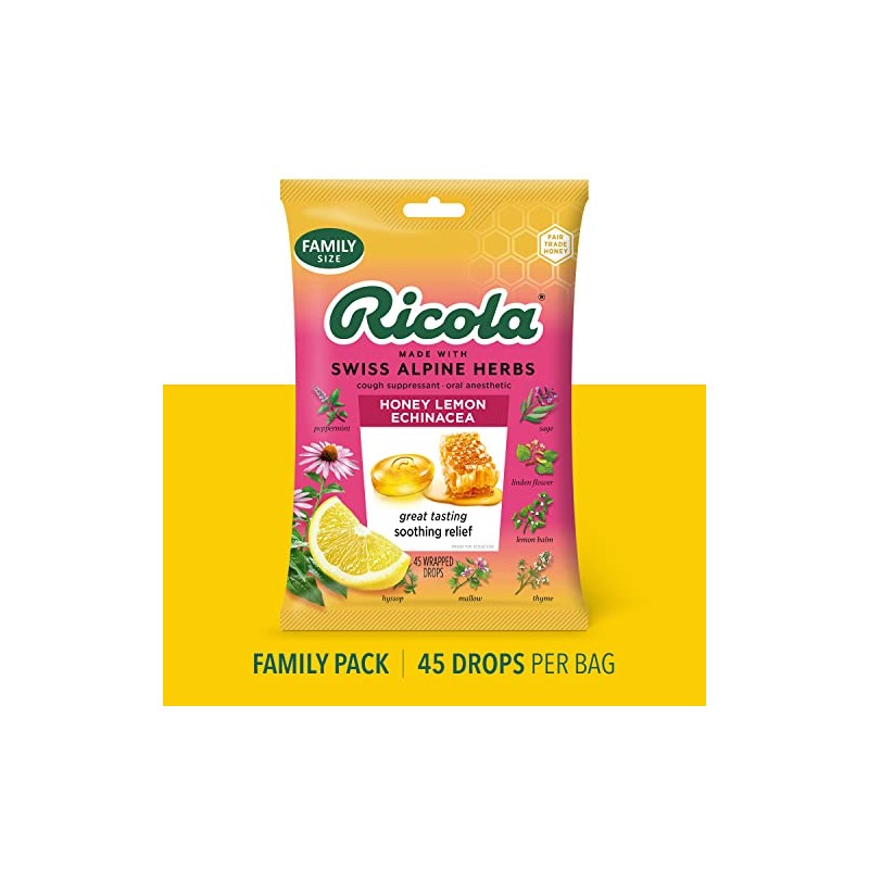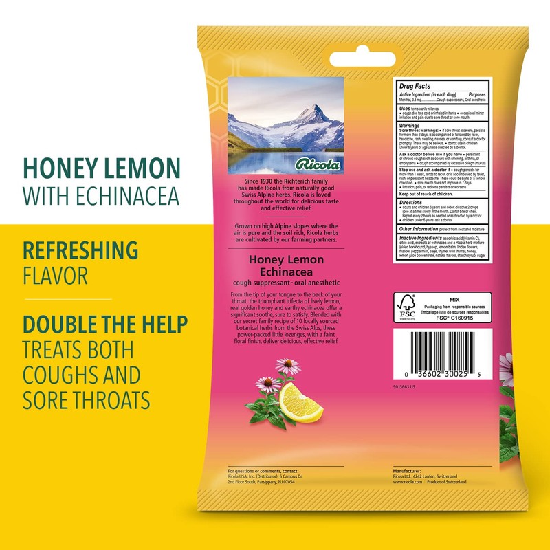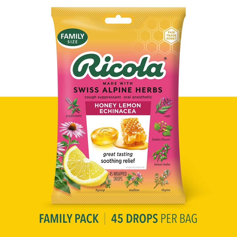 - RICOLA HONEY LEMON WITH ECHINACEA HERBAL THROAT DROPS: Soothe your coughs and relieve your mild sore throats using Ricola Honey Lemon with Echinacea. Its pleasing taste comes from real golden honey with refreshing herbal lemon balm. Plus, we add Echinacea extracts along with our famous Swiss mountain herbs. Making it one flavorful drop of goodness. Active Ingredient (in each drop): Menthol, 3.5 mg