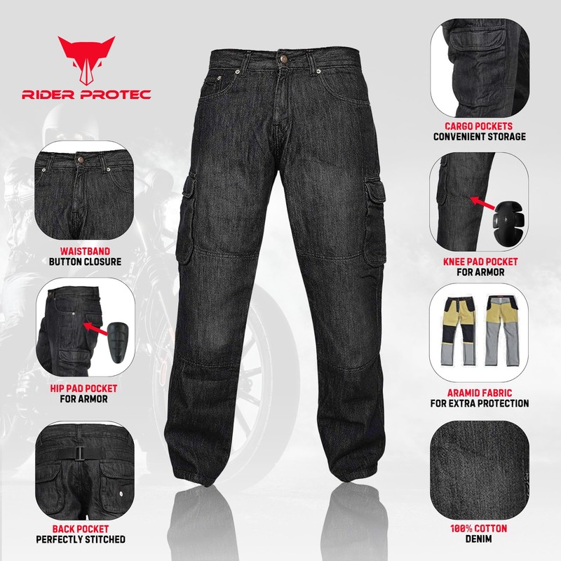 Rider Protec® Mens Motorcycle Pants with Reinforced Aramid Lining Hip and Knee Protective Pads Motorbike Riding Jeans Black