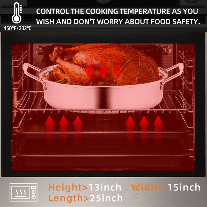 - Riveted Handles for Heavy Loads】Our roasting pan features thickened riveted stainless steel handles , which are firm and stable. No more burned hands or spills when moving from oven to table – ideal for holiday dinners or large roaster pan with rack meal prepping.