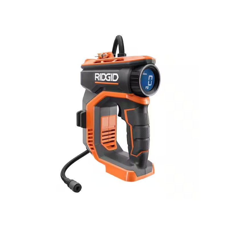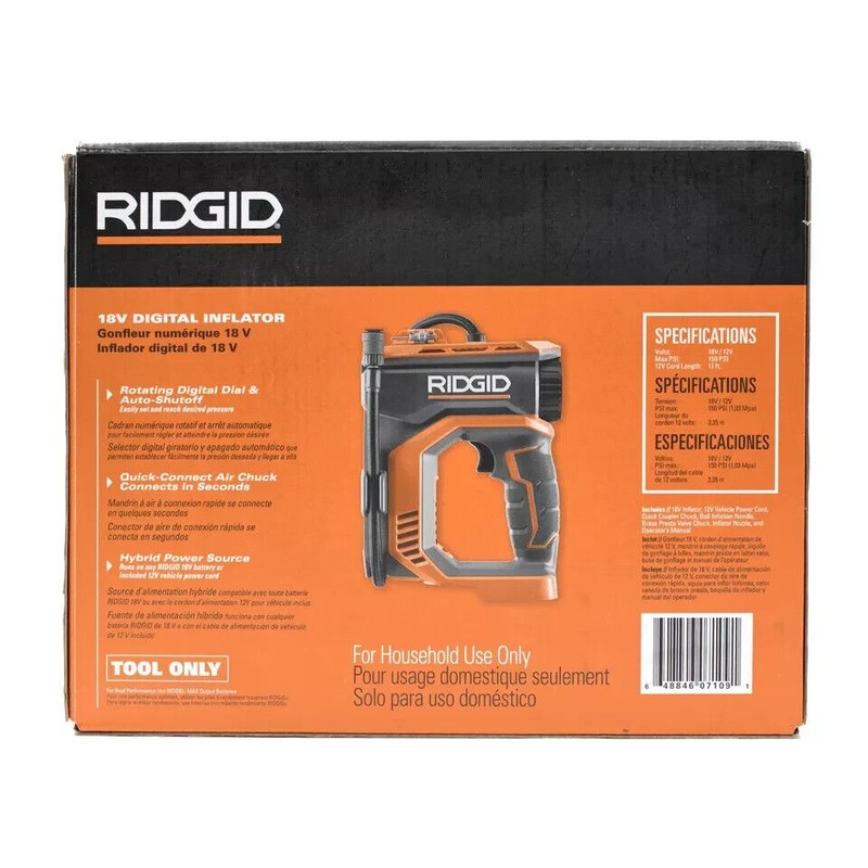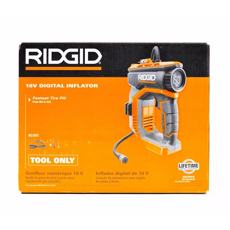 RIDGID introduces the 18V Digital Inflator (Tool Only). This tool provides the fastest truck tire fill from flat to full. This tool is backed by the Industry's Only Lifetime Service Agreement, simply register within 90 days of purchase for FREE Parts, FREE Service, For LIFE. The 18V RIDGID Cordless High-Pressure Inflator includes a 12-Volt Vehicle Power Cord, Quick Coupler Chuck, Ball Inflation Needle, Brass Presta Chuck, Inflator Nozzle, and operator's manual. Battery and Charger sold separately.