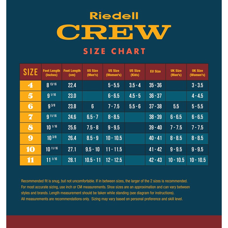 Whether you’re hitting up the boardwalk, skating your favorite trail, or dancing in the park, nothing beats rolling outside with your friends. That’s the inspiration behind the all-new Riedell Crew outdoor roller skate. To create the Crew, we started with our durable and classic 120 boot as a base and then added some colorful contemporary flair and sophisticated touches. The Crew is available in 3 unique colorways, Crimson, Ocean, and Turmeric, and features colorful contrasting accessories. The comfortable high top boot rides on the Thrust Nylon plate and is finished with Sonar Zen 62mm outdoor wheels for a smooth ride, ABEC-5 bearings, and colorful adjustable toe stops. Live it up with your friends and let the good times roll with the Riedell Crew!