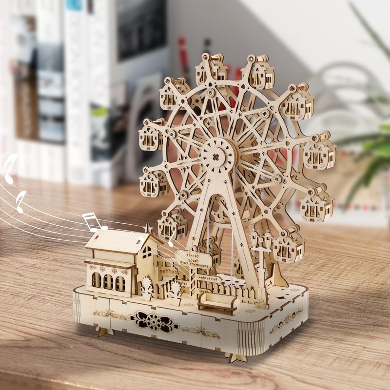 - 【Riesenrad Holz】 Eine Musikkasten - Nachdem Sie das Modell fertiggestellt haben, wickeln Sie es mit einem Schlüssel im Uhrzeigersinn auf, das Riesenrad dreht sich und die Musik wird eingeschaltet.Im Lieferumfang ist eine Lichterkette zum Selbermachen enthalten, um das Riesenrad noch mehr zum Glitzern zu bringen. LED Lichterkette (warm und farbig nach Belieben).