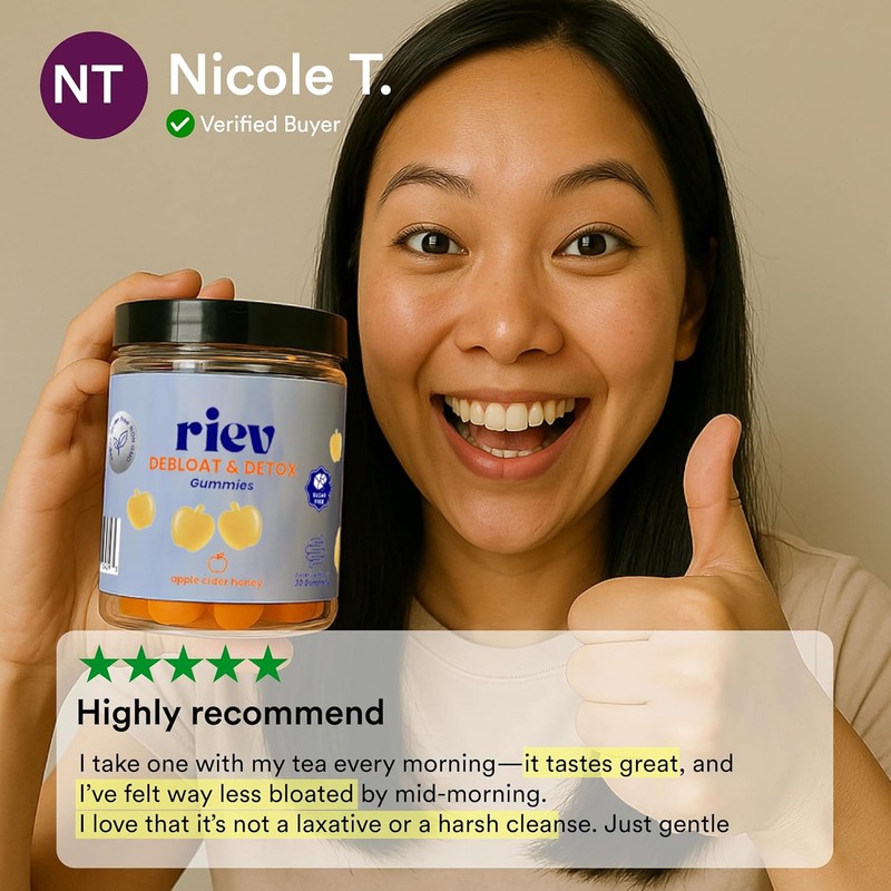 Riev Debloat & Detox Gummies – Apple Cider Honey Flavor – With Ginger, Dandelion & Magnesium – Daily Gut & Digestion Support – Sugar-Free, Vegan, Non-GMO – 30 Count