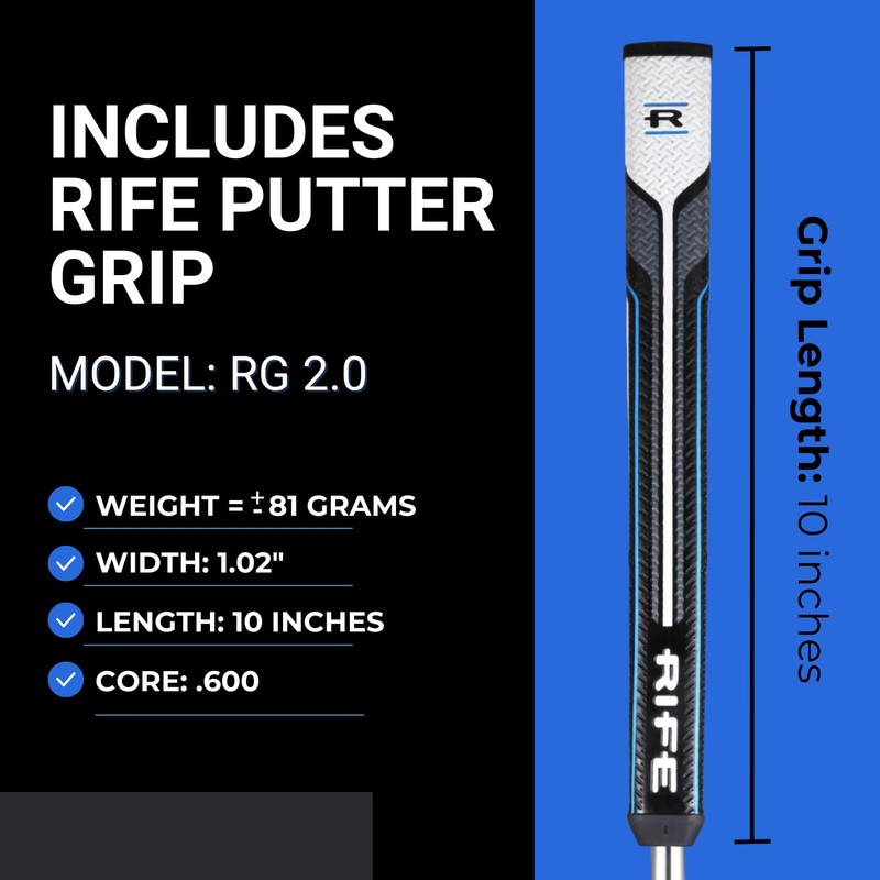 • Assembled with Rife 2.0 Black/Blue/Gray Putter Grip