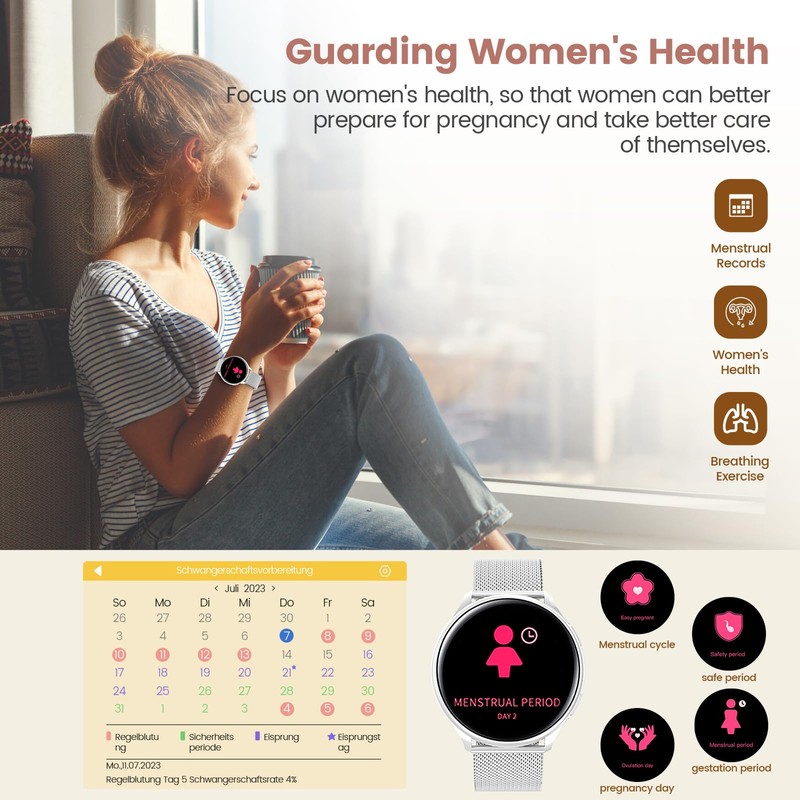 - 【Focus on Protecting Women's Health】: The new smart watch for women can monitor heart rate in real time, measure blood pressure and oxygen content in the blood, automatically record sleep and record many other functions. There is also a menstrual tracking function that helps women predict and record their menstruation and the time of ovulation to have a good experience with pregnancy and childbirth with better care and more accurate preparation. You can also relax your body and relieve menstrual pain with the breathing training function (download app: Fit Cloud Pro)