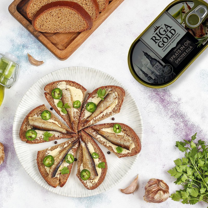 - Riga Gold Smoked sprats in Oil can be enjoyed in a variety of ways. It can be eaten on its own as a snack, or used as an ingredient in salads, sandwiches, and pasta dishes. Its rich and savory flavor makes it a great addition to many recipes.