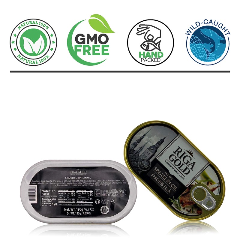 - Riga Gold Sprats are smoked in the traditional way, on alder wood chips. The secret of high quality is simple - the fish is smoked fresh and packed into jars by hand. Are GMO and BPA free.