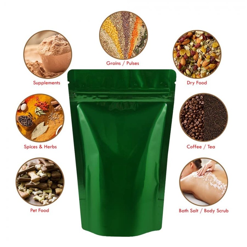 - IDEAL FOR FOOD STORAGE: For packing food like chocolates, pick and mix, protein powder, herbs, supplements, pet food, and many other things, green shiny packaging bags work best. The product is preserved with UV sunlight, heat, humidity, and a closed zipper facility to keep moisture out and to keep it fresh and delectable for a longer period of time.