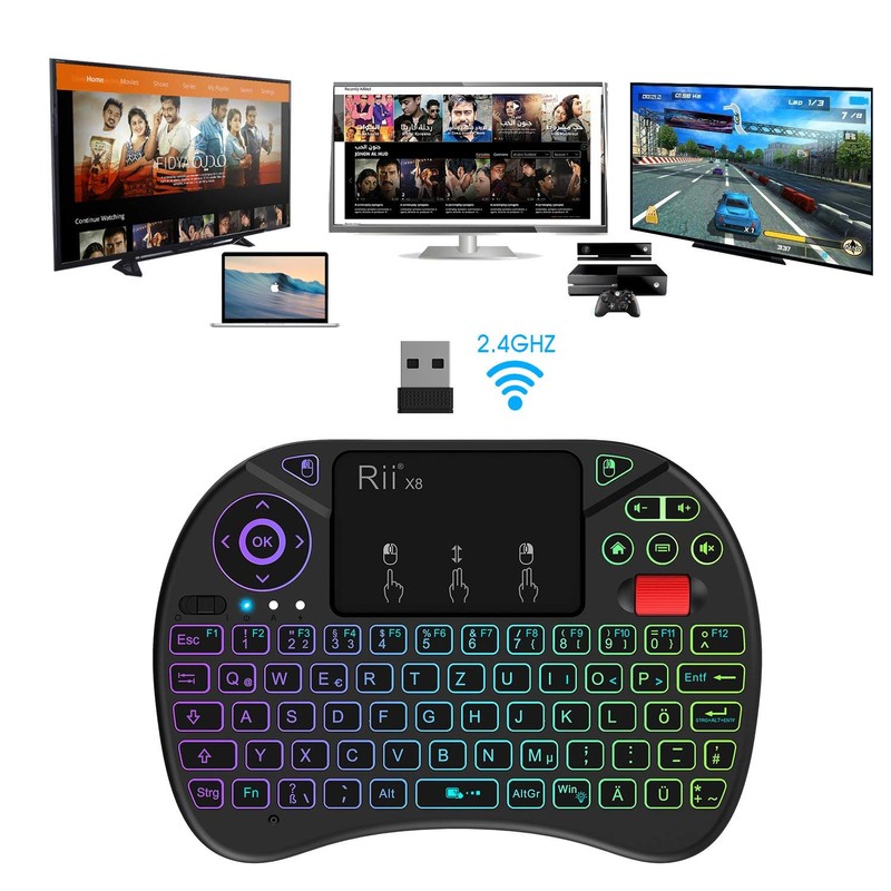 Rii Mini Tastatur mit Touchpad, Smart TV Tastatur, 2,4 GHz Kabellos Tastatur mit 8 Farbige Hintergrundbeleuchtung und Scrollrad (Deutsches, Schwarz