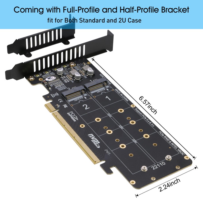 - [Wide Compatibility] Compatible with M.2 PCI-e NVMe SSDs in all sizes:110x22mm. 80x22mm, 60x22mm and 42x22mm; Not support any M.2 (SATA-Based B+M Key) SSD; Motherboard Compatibility: Most Server and X299, X399 can support PCIe x16 Bifurcation