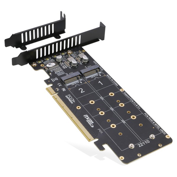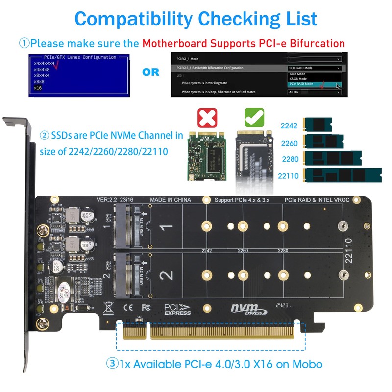- Hardware requirement: 1. There is available PCI-e 4.0 or 3.0 x16 Slot on Mobo 2. The motherboard can support PCIe x16 Bifurcation itself, and can be set as"PCI-e x4x4x4x4" in BIOS (Please Note: X8X4X4 or X4X4X8 mode can only recognize 3x NVMe SSDs) 3. All of the SSDs are M.2 PCI-e (M Key) NVMe SSD 4. CPU has enough channels to support