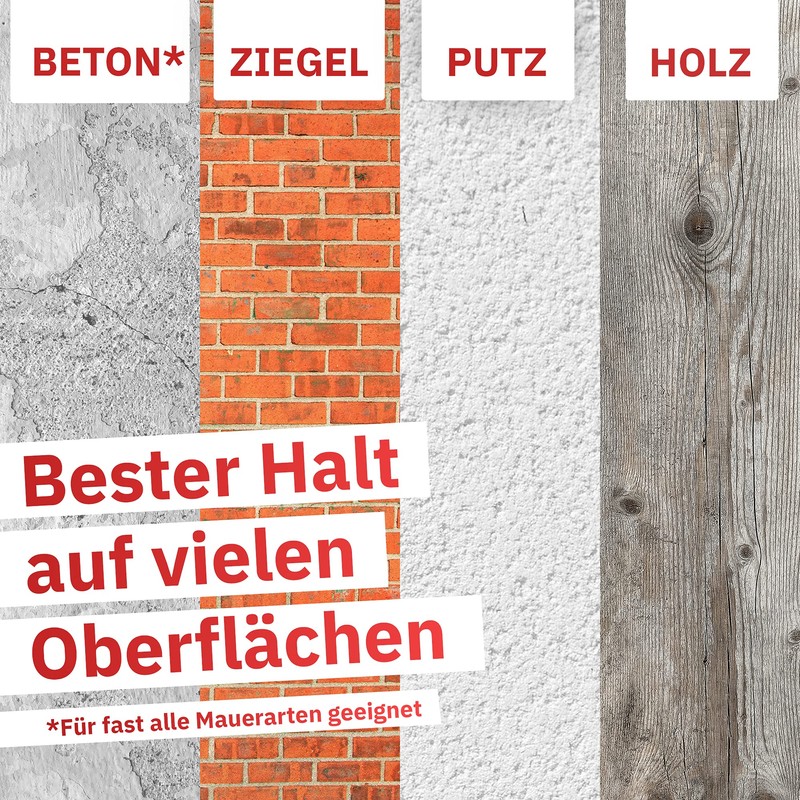 - Various surfaces: the application on a wide range of surfaces is ensured by the high stability of our steel pins. This means that the use of nails in use on most types of concrete walls, brick, plaster and wood is no problem