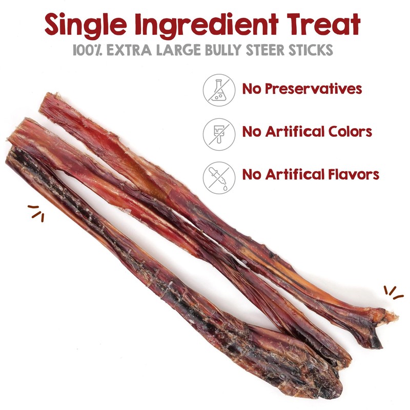 - Made in USA - These 12 inch bully sticks for dogs made in USA ensure high quality and safety. Perfect for large to XL breeds, these beef sticks for dogs offer a healthy, satisfying treat.