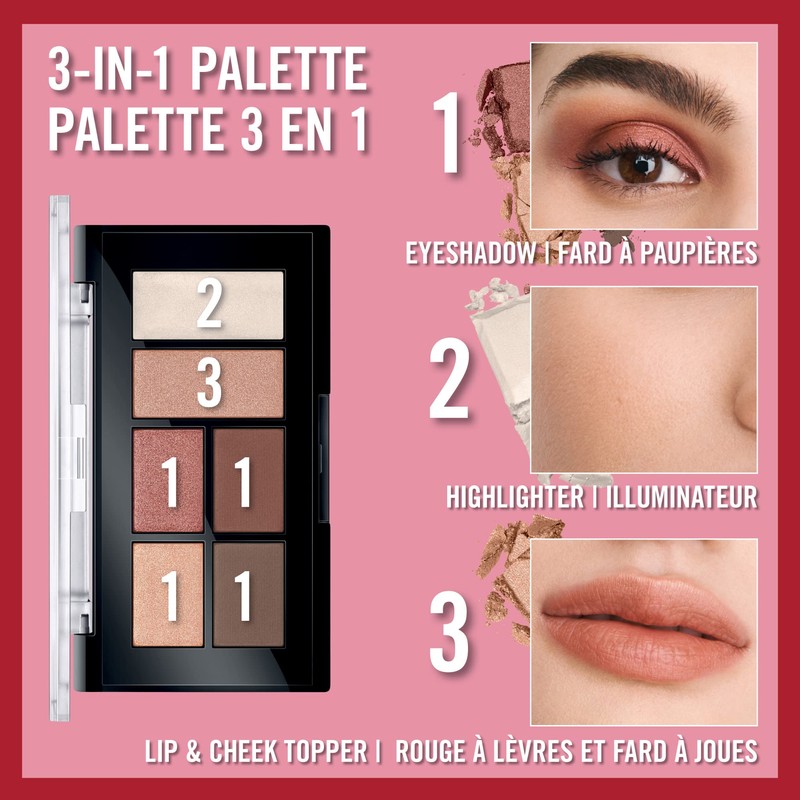 - 3 In 1 format including 4 eyeshadows, 1 powder highlighter and a creamy lip and cheek topper