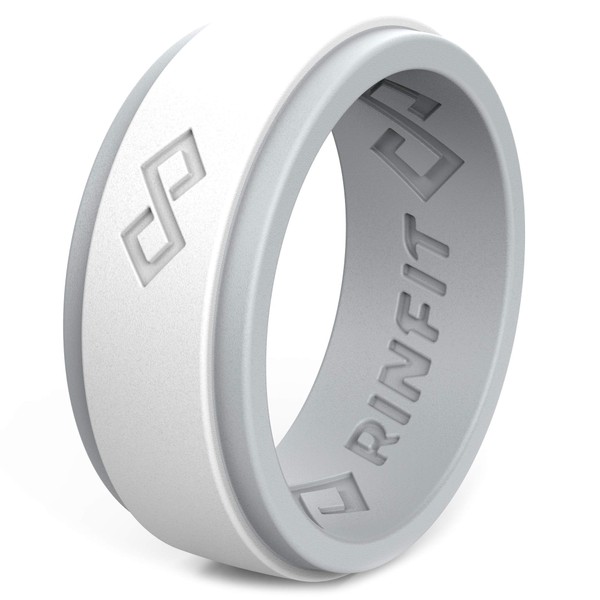 Rinfit Silicone Rings for Men 9mm Wide, 2mm Thick - Mens Rubber Wedding Bands - Infinity Ring with 2 Layers - Light Gray & White, Size 10